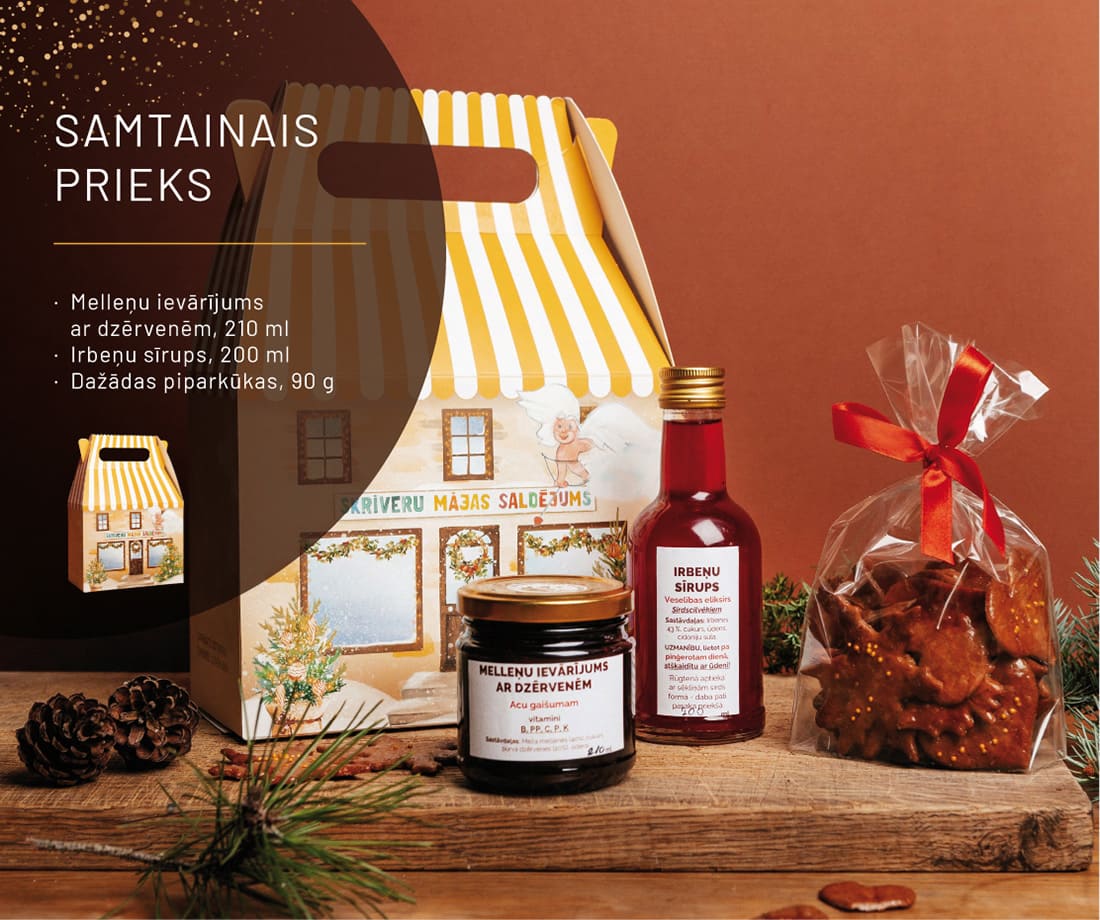 • Kaste ar oriģinālu dizainu, sarkana atlasa lenta un sveiciena kartiņa.