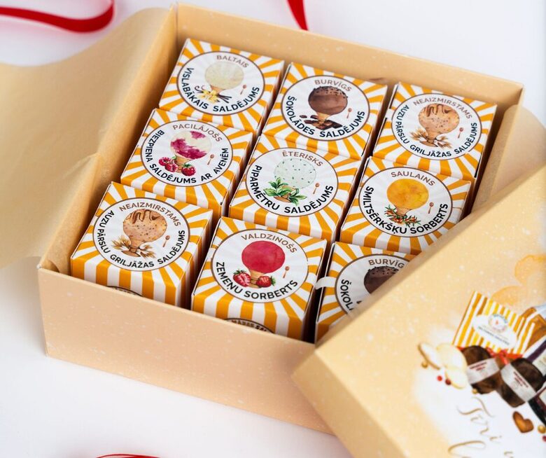 Gribas pārsteigt draugu pastaigā gar jūru? Pikniks mežā? Viens pats mājās? Tad noderēs tieši TERMOKĀRBA. Piena saldējumi gatavoti no svaiga govs piena, pievienojot olu dzeltenumus un krējumu. Izvelies kādu no 12 veidiem. Nobaudi absolūtu klasiku – rozīņu saldējumu, kur rozīnes maigi ielīp zobos kā saldas karameles! Termokārba